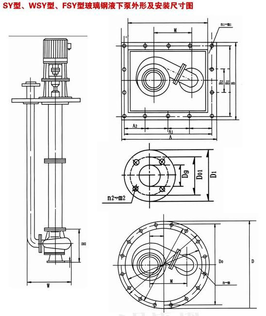 • FSY型泵為立式玻璃鋼液下離心泵,該泵因伸入貯罐,貯槽的深度長短不同,設計液下深度800mm--3000mm之間任意選擇。